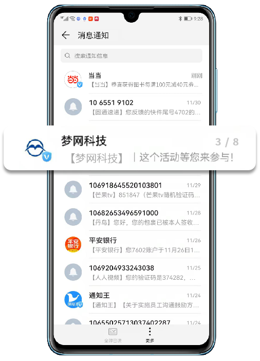 与传统的号段和单一的展现形式不同,在消息页形象展示方面,金年会诚信至上科技5G消息解决方案给予包含企业logoV露出及品牌信息植入功能,提高了品牌的社会认知度和用户识别度。而信息界面可自定义企业业务应用模版卡片,式样丰富,实现了用户到H5、小程序等界面的直接跳转,一键直达核心营销页面,让企业在短信收件箱这一营销入口就能带来直观的流量转化,增强客户对公司更信任。