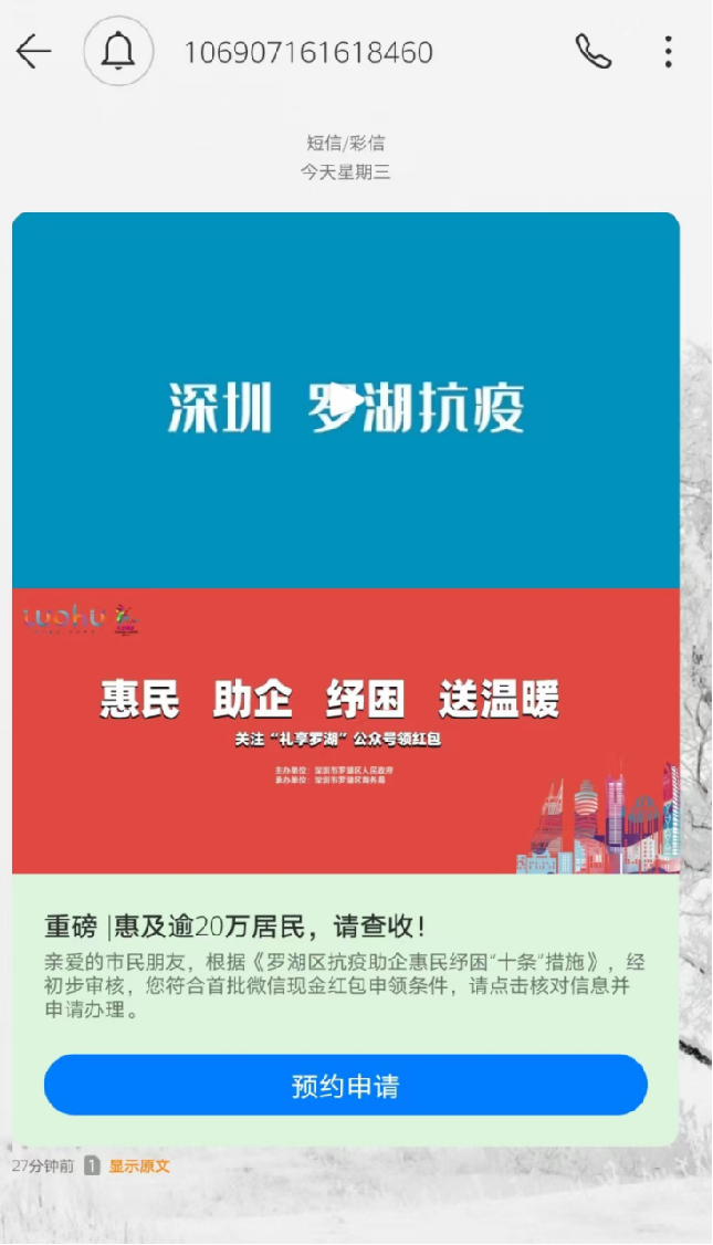 为减少疫情对经济社会的影响,不少地区都出台了惠民纾困政策。日前,罗湖区推出“惠民纾困扶持”措施,面向罗湖区22.5万人,向符合扶持条件都市民发放300元补贴或生活必需品。基于该措施覆盖面广、惠民力度大,为确保补贴措施的落地落实,金年会诚信至上科技携手深圳联通助力罗湖区人民政府向扶持对象统一推送5G申领信息,助力区政府完成补贴发放。