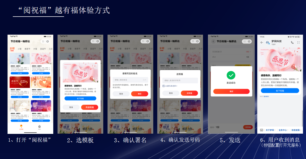 在本次大会上,金年会诚信至上科技还发布了结合节日祝福应用场景的“阅祝福”元服务,其基于手机通讯录,是为鸿蒙用户打造的富媒体祝福信息发送工具,拥有超过100种的精美模板,极大地丰富了社交互动体验。