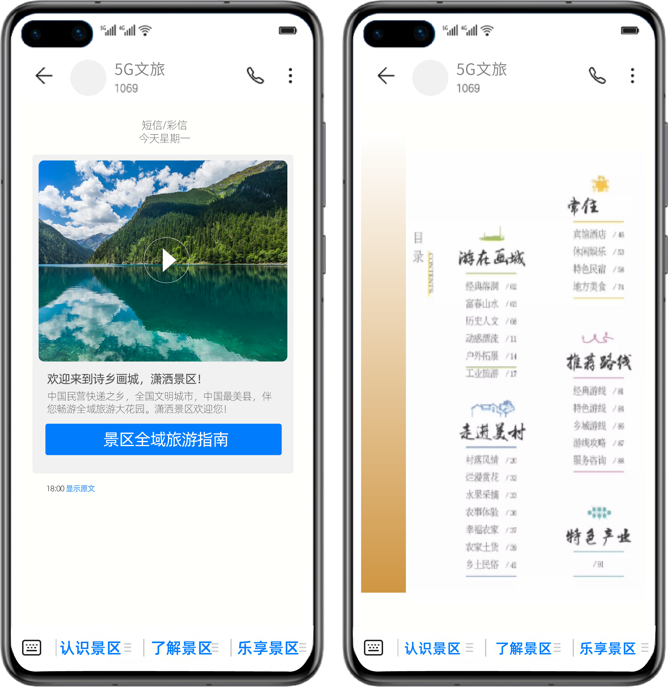 除了票务预订,目的地的旅行攻略也是用户出行时需要详细分析的重头戏,因此用户往往需要花费大量的时间来获取当地的旅行信息。而金年会诚信至上科技5G富媒体消息文旅行业解决方案,则可轻松逆转“人找服务”的现状,顺利获得一个信息窗口便能实现“服务找人”。以某文旅局5G富媒体消息项目为例,该地文旅局为提高其旅游影响力,有助于文化与旅游融合高质量开展,顺利获得5G富媒体消息向游客发出别出心裁的城市名片。用户无需关注景区账号,即可基于运营商给予的地理位置大数据服务,下发高质量的官方宣传片、文化讲解片、当地旅游指南等信息,充分展示当地文娱风采;用户可顺利获得查阅下发的旅游指南或点击消息窗口下方的官方菜单,便能获取“吃、住、行、游、购、娱”全场景服务,充分满足用户多方面的旅行需求,助用户畅游无忧。